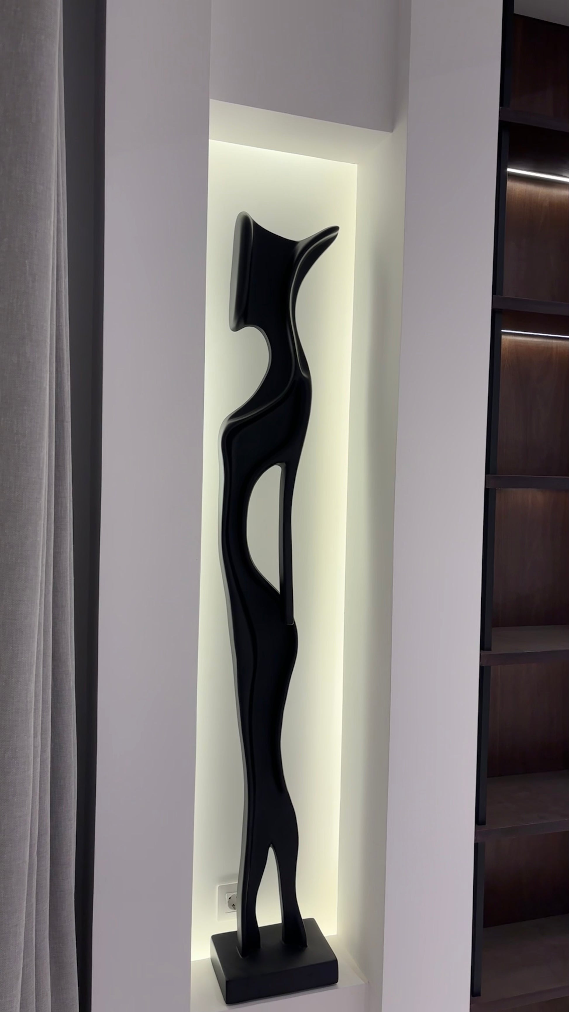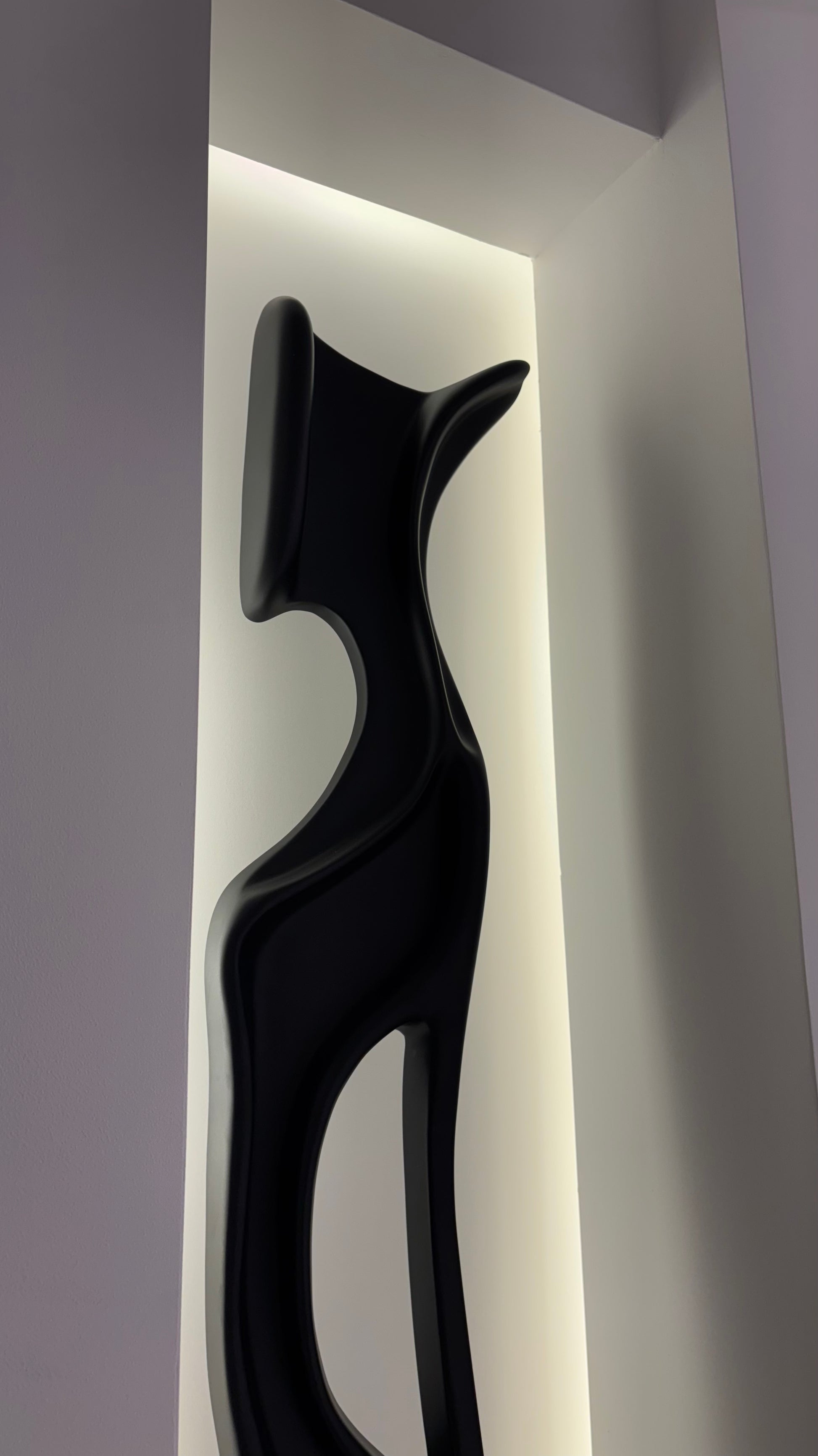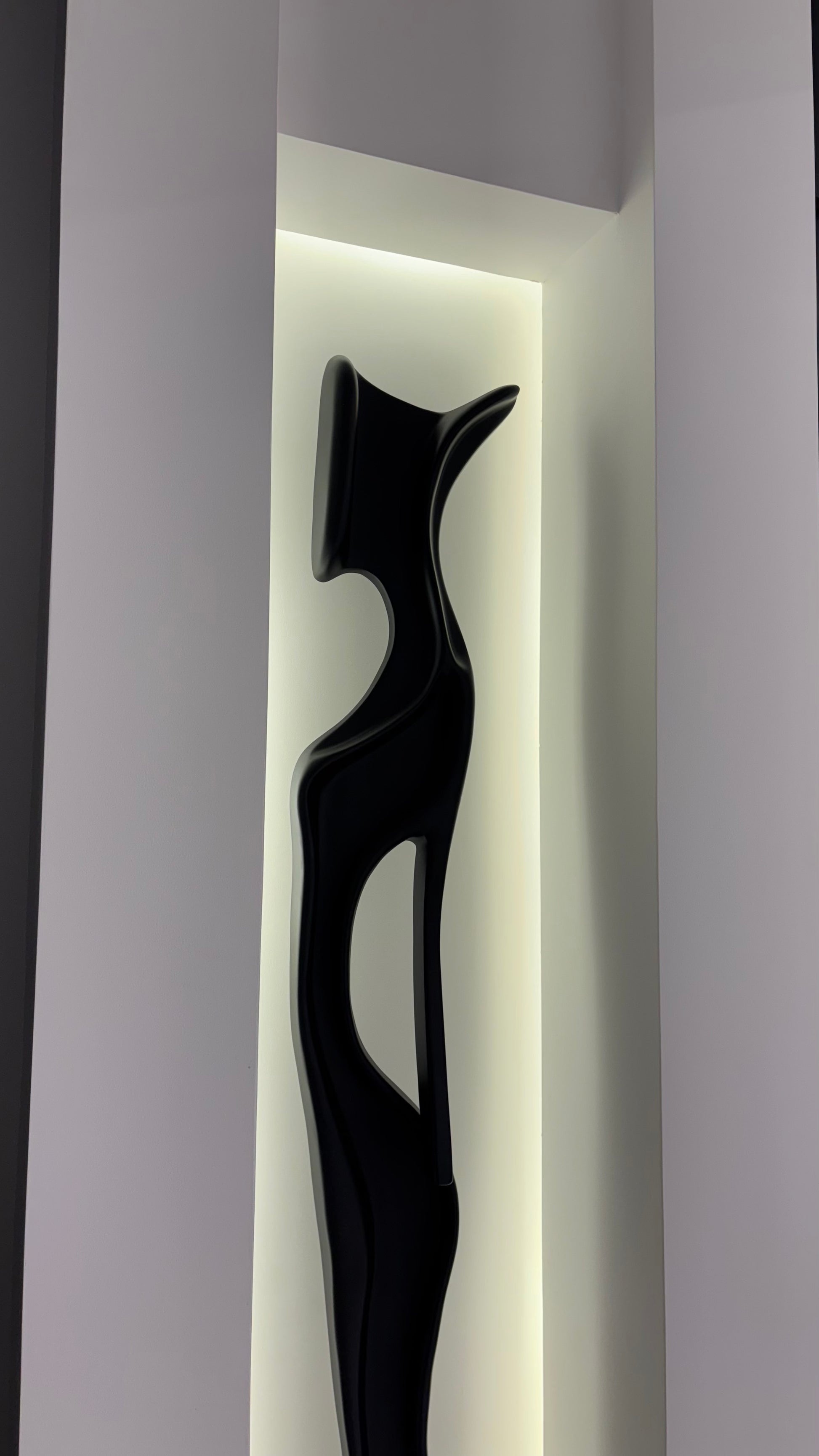 “Night Bloom” is a captivating exploration of fluid form and hidden light. Its tall, slender silhouette is carved with delicate curves and negative space, suggesting a flower unfurling in the stillness of evening. The deep black finish creates a striking contrast against any backdrop, highlighting the sculpture’s graceful contours. Both dramatic and serene, “Night Bloom” draws the eye with its sense of unfolding potential, inviting observers to marvel at the artful interplay of shadow and shape.