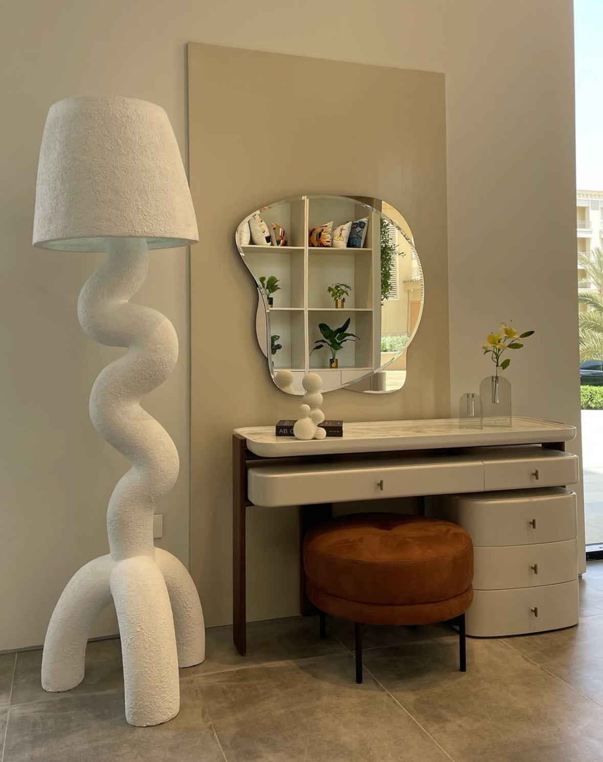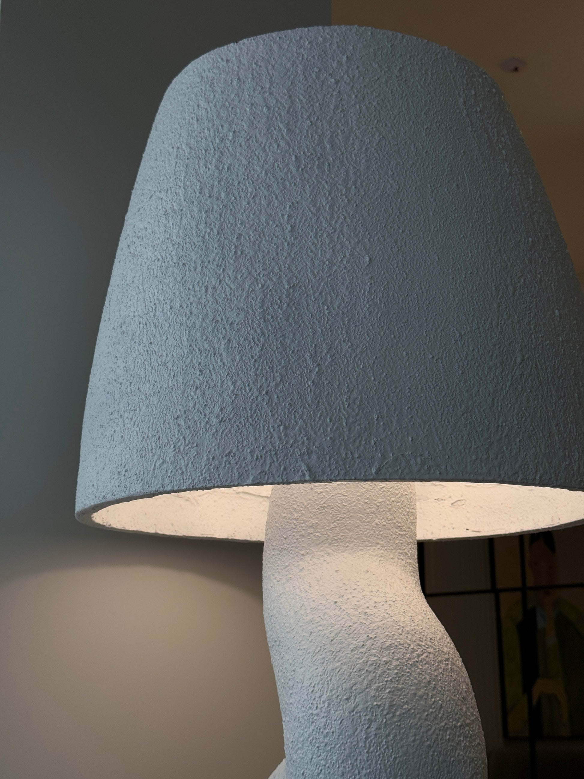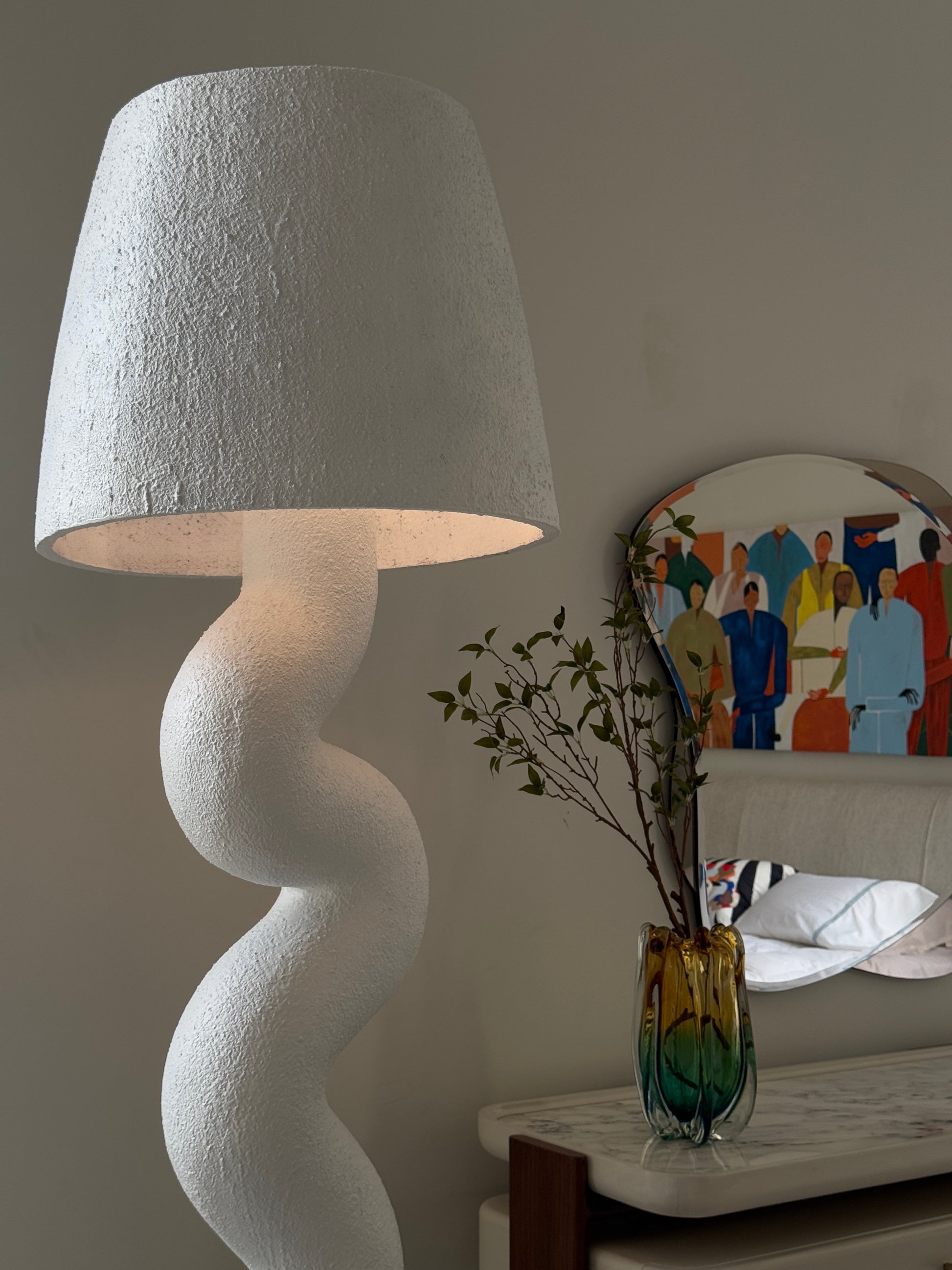 A sculptural lamp with a textured, twisting base that brings a sense of movement and organic elegance. Its soft glow and unique shape make it a statement piece for any space.